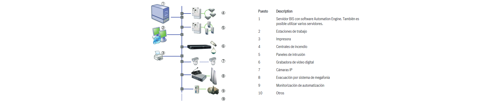 • Permite conectar, controlar y supervisar los sistemas de seguridad de Bosch o de otros fabricantes, las centrales de incendio, los paneles de intrusión, los sistemas de megafonía y otros a través de la interfaz OPC.