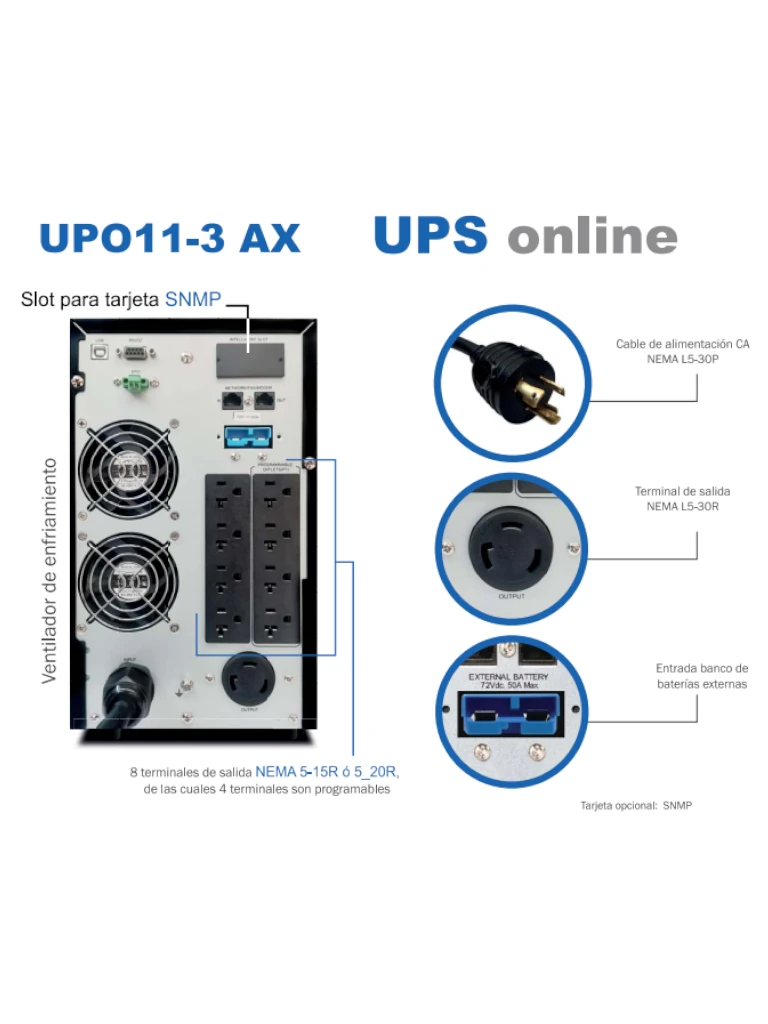 Es un UPS Online diseñado para proporcionar respaldo y protección energética de alta calidad para tus equipos críticos. Con una capacidad de 3000 VA y 3000 W, este UPS asegura que tus dispositivos permanezcan operativos incluso durante cortes de energía prolongados y fluctuaciones de voltaje.