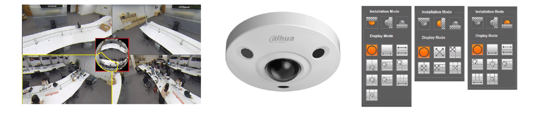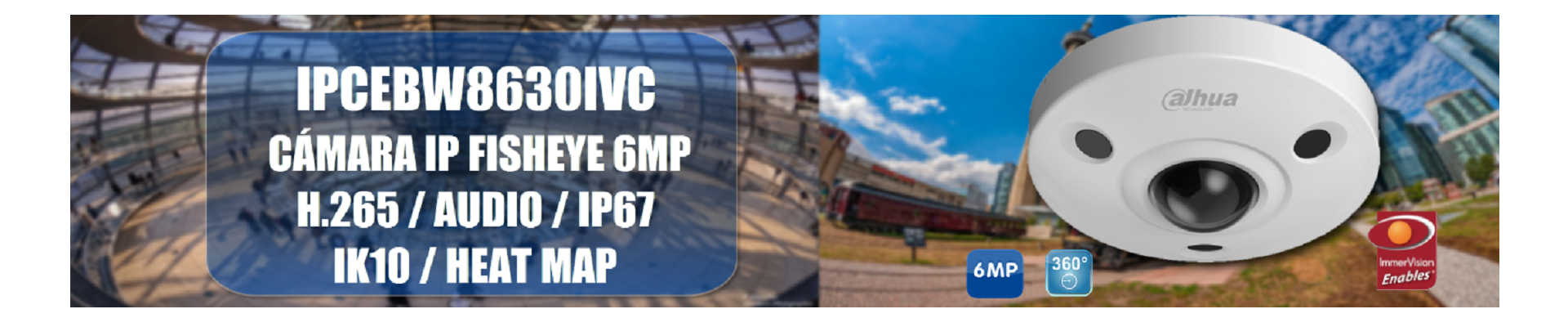 La cámara IPCEBW8630IVC cuenta con la función Dewarping, la consiste en realizar la descomposición de la imagen que se obtiene en 180° y 360° dependiendo de la posición en la que se instale. Esta característica se podrá observar en tiempo real y al realizar un respaldo, esta función también se podrá observar desde el software Smart PSS en tiempo real y al revisar grabaciones.