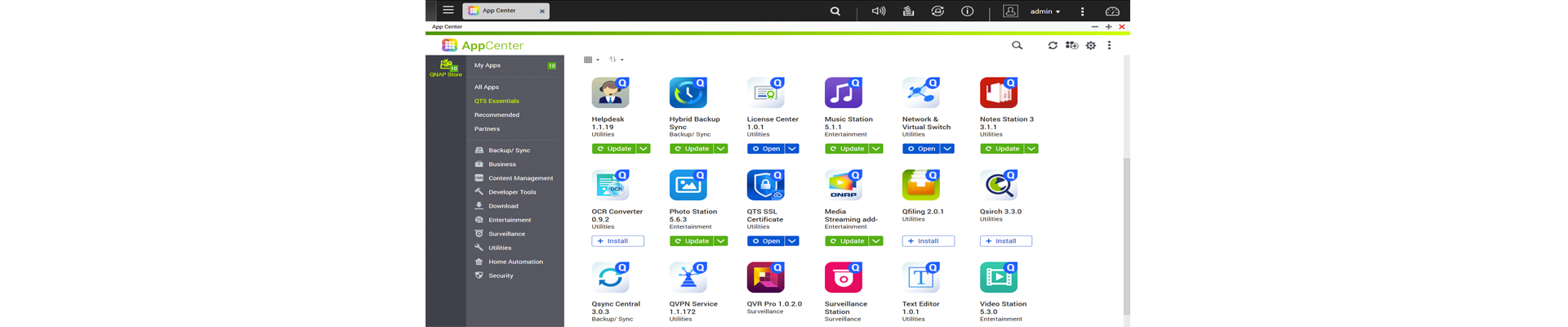 QTS, el sistema operativo del NAS de QNAP ofrece numerosas adiciones y mejoras del funcionamiento, como son Qtier renovado, compatibilidad para RAID 50/60, Qboost, OCR Converter y mucho más. En el App Center de QTS existen más aplicaciones disponibles, como son Domotz, QVPN Service, etc. Puede aprovechar con facilidad estas aplicaciones de QNAP y de otros proveedores confiables para ampliar la funcionalidad y las posibilidades del NAS.