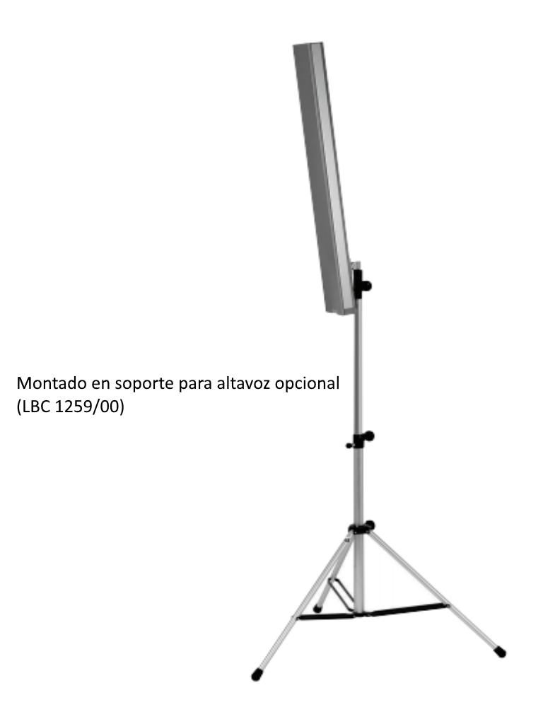 Se ha desarrollado un método de montaje que ahorra tiempo y trabajo para el modelo LBC 3201/00. El altavoz cuenta con un gráfico en el que se muestra la altura de instalación idónea para el área que debe cubrir. Cuando se ha determinado la altura apropiada para un área determinada, se monta el altavoz en un ángulo marcado en el soporte de montaje. Este procedimiento es mucho más sencillo y preciso que los tradicionales modos de instalación por prueba y error. El LBC 3201/00 puede montarse en una pared o directamente en un soporte de suelo LBC 1259/01 con un pasador roscado M10 sin accesorios adicionales.