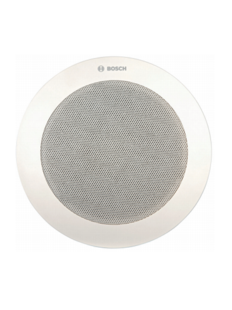 Altavoz de techo de 6 W, gran ángulo de apertura para todas las frecuencias de octavas, rejilla de ABS independiente con rejilla metálica, montaje en techo con dos abrazaderas atornilladas, con certificación EN54-24, blanco RAL 9003.