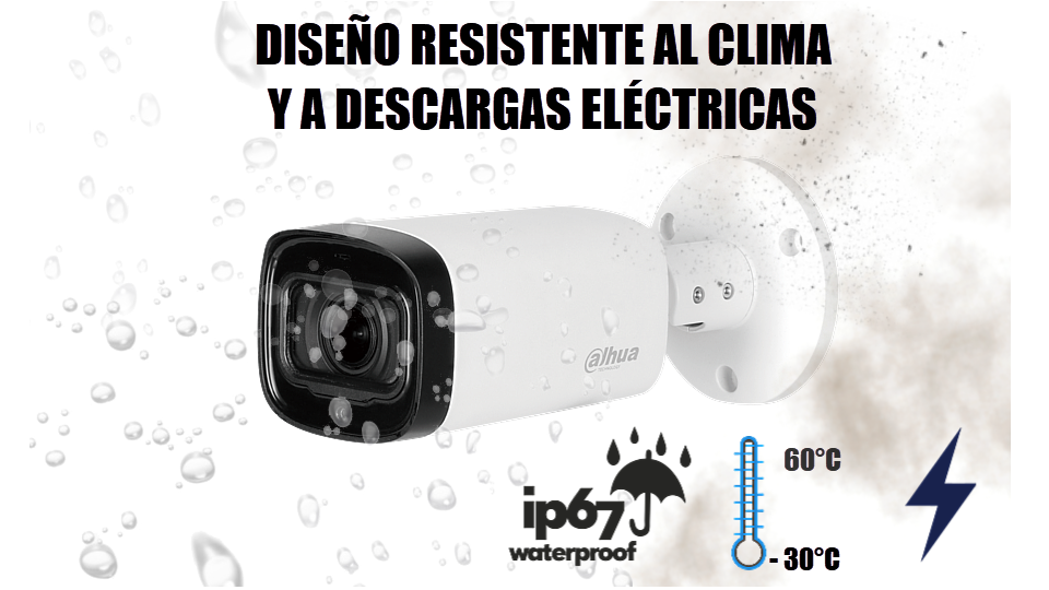 Una de las ventajas que nos proporciona este modelo es que tendremos una visión de H: 92°~29° con su lente varifocal manual de 2.7 A 12mm. Además la cámara es a prueba de agua con índice de protección IP67 lo que le permite ser utilizada para el exterior, ya que esta diseñada para que no ingrese polvo y agua.