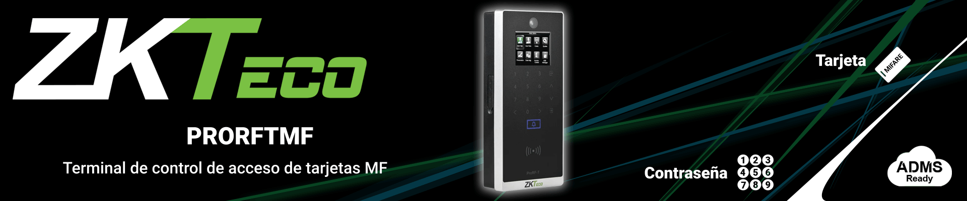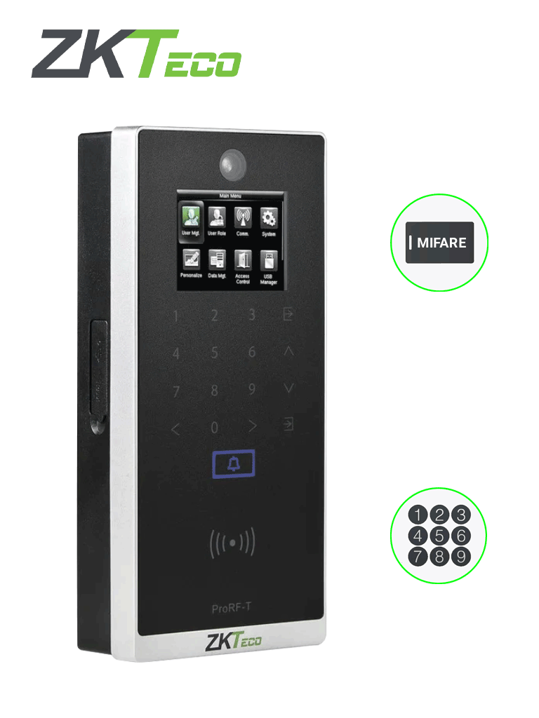 El dispositivo para el control de acceso ProRF-T es una terminal con lector para tarjetas de proximidad Mifare incorporado con pantalla TFT LCD de 2,4 pulgadas. La pantalla a color y la nueva estructura de firmware ofrecen un menú práctico para una fácil gestión, así como la capacidad de capturar una foto al momento de generar un evento de acceso. La plataforma de hardware ZMM220 tiene una frecuencia de reloj de 1,2 GHZ, lo que mejora en gran medida la velocidad de verificación. El teclado táctil permite operaciones fáciles y convenientes, como administrar usuarios, acceder a la configuración de parámetros de control o leer informes.