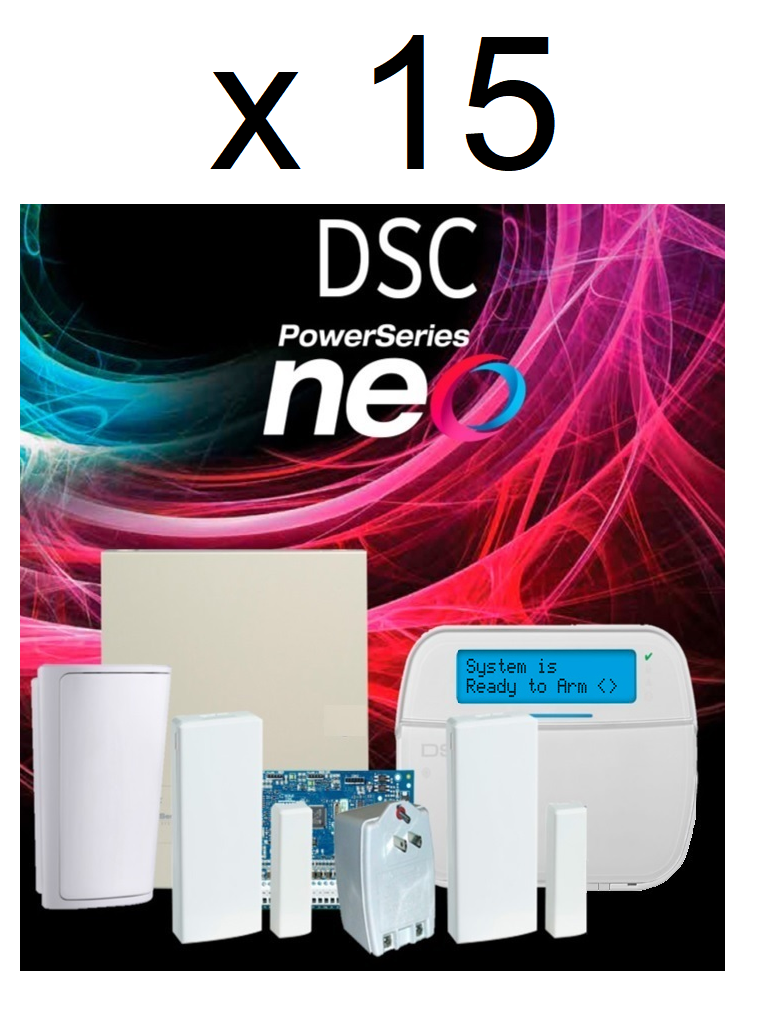 DSC 15 NEO-RF-LCD-SB - 15 Paquetes NEO con 32 Zonas Inalámbricas / Panel HS2032/ Teclado LCD Alfanumérico HS2LCDRF9N /Gabinete GMX003 /2 Magnéticos Inalámbricos PG9303 /1 Detector de Movimiento PG9914 /Transformador PTC1640/Sin Batería #PLANDEBENEFICIOS