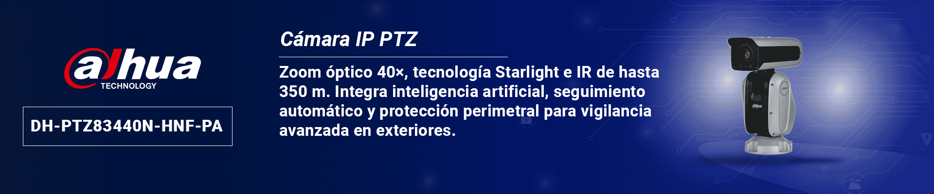 La cámara PTZ Dahua DH-PTZ83440-HNF-PA forma parte de la línea WizMind, diseñada para proyectos de videovigilancia de alto nivel. Incorpora un sensor STARVIS™ de 1/1.8”, zoom óptico de 40× y tecnología Starlight para un excelente desempeño en condiciones de poca luz. Su iluminación infrarroja alcanza hasta 350 metros, ideal para grandes áreas. Integra algoritmos avanzados de inteligencia artificial que permiten protección perimetral precisa, reconocimiento facial, metadatos de video y seguimiento automático de objetivos. Su diseño robusto IP67 la hace apta para entornos exteriores exigentes.