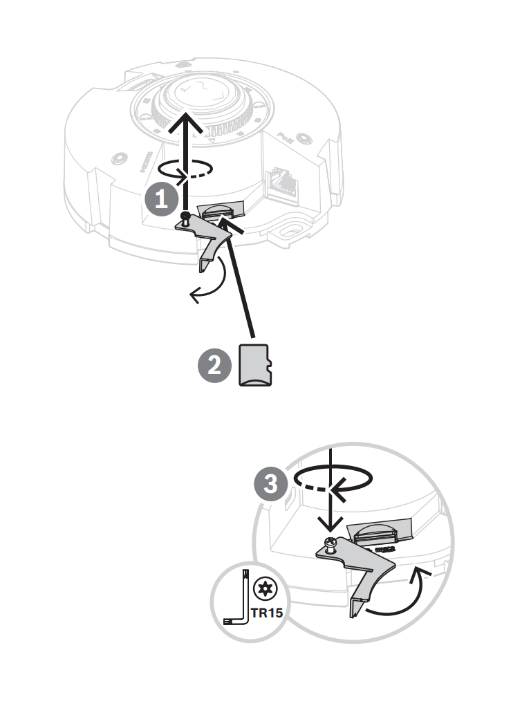 Inserte una tarjeta de memoria en la ranura para tarjeta para almacenar una grabación con alarma local de hasta 2 TB. La grabación previa a la alarma en la RAM reduce el ancho de banda de grabación en la red y amplía la vida efectiva de la tarjeta de red.