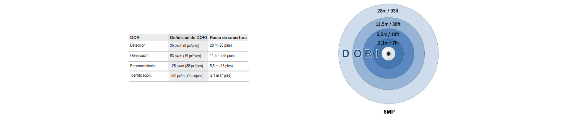 DORI (Detectar, Observar, Reconocer, Identificar) es un sistema estándar (EN-62676-4) para definir la capacidad que tiene una persona al mirar el vídeo para distinguir personas u objetos dentro de un área de cobertura. A continuación se muestra la distancia máxima a la que una combinación de cámara/lente puede cumplir estos criterios: Cuando se monta a una altura de 3 m (10 pies), la cámara dispone de los siguientes radios de cobertura para los cuatro niveles DORI para una persona en la escena: