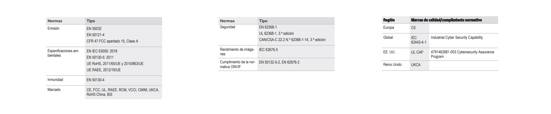 Se han emprendido medidas especiales para garantizar un máximo nivel de seguridad para el acceso a los dispositivos y para el transporte de datos. La protección con contraseña de tres niveles con las recomendaciones de seguridad permite a los usuarios personalizar el acceso a los dispositivos. Además, el acceso al navegador Web puede protegerse mediante HTTPS y las actualizaciones del firmware también se pueden proteger con cargas seguras autenticadas. Las cámaras disponen de hardware integrado de Secure Element (SE) que proporciona la funcionalidad principal de Trusted Platform Module (TPM) con el fin de garantizar los niveles más altos de seguridad de datos y protección de privacidad. Junto con la compatibilidad con la infraestructura de clave pública (PKI), se garantiza una protección superior frente a ataques malintencionados. También admite autenticación de red 802.1x con clave de codificación EAP/TLS y RSA de hasta 4096 bits, lo que garantiza la seguridad de los datos más allá de 2030. La gestión avanzada de certificados ofrece: