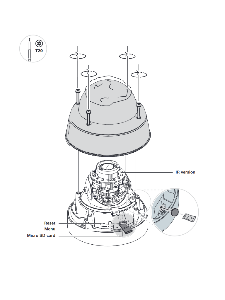 La ranura admite tarjetas de memoria microSD con capacidad de almacenamiento de hasta 2 TB. Para las grabaciones con alarmas locales se puede usar una tarjeta microSD. La grabación previa a la alarma en la RAM reduce el ancho de banda de grabación en la red o, si se utiliza la grabación en tarjeta microSD, amplía la vida efectiva del medio de almacenamiento.