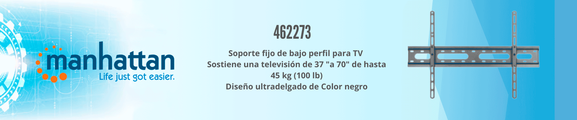 El soporte fijo de bajo perfil para TV de Manhattan permite instalar televisores de 37" a 70" con un peso de hasta 45 kg (100 lb) de forma segura y estética. Este soporte ultradelgado mantiene la pantalla a solo 27 mm (1 pulgada) de la pared, resaltando el diseño moderno de la televisión. Fabricado en acero con recubrimiento en polvo, es ideal para aplicaciones residenciales, comerciales y educativas. Compatible con pantallas planas y curvas, cumple con los estándares VESA para diversas configuraciones de montaje.
