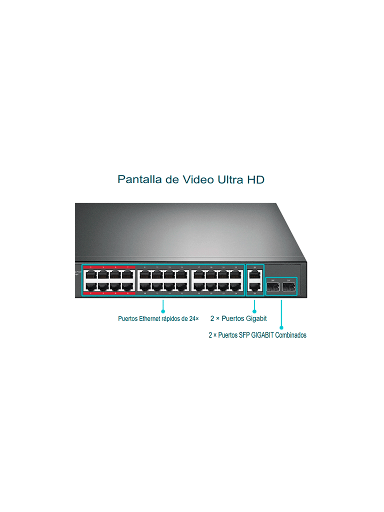 2 puertos Gigabit RJ45 y 2 puertos combinados Gigabit SFP garantizan una transmisión fluida incluso cuando las cámaras IP HD de 24 × funcionan simultáneamente.