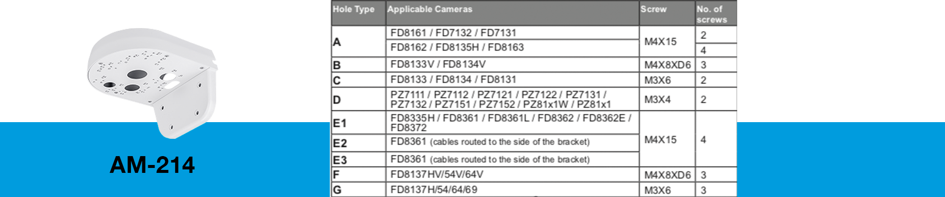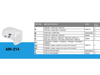 El AM-214, es compatible, con los siguientes modelos de cámara: FD8134, FD8134V, FD8137H, FD8137HV, FD8154, FD8154V, FD8164, FD8164V, FD8169.