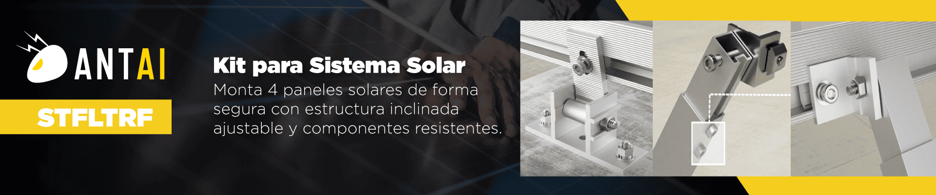 El kit de montaje ANTAI STFLTRF permite instalar hasta 4 paneles solares en disposición vertical, con un sistema ajustable que ofrece tres rangos de inclinación: 0°-15°, 15°-30° y 30°-45°, según necesidades del sitio. Está diseñado para techos de concreto o metálicos y fabricado con aluminio anodizado AL-6005-T6 y acero inoxidable SUS304, proporcionando excelente resistencia a la corrosión. El sistema incluye todos los elementos esenciales como rieles, patas ajustables, abrazaderas, clips de tierra, agarradera de tierra y tornillos de expansión, garantizando un montaje robusto, seguro y eficiente para instalaciones solares residenciales o comerciales.