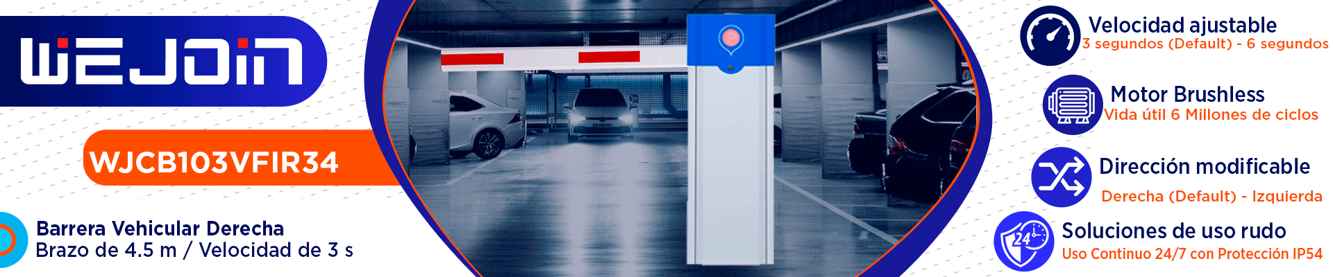 La barrera vehicular WJCB103VFIR34 es ideal para uso intensivo, destacando por su alta velocidad y rendimiento. Cuenta con un motor brushless de 24 Vcc, engranaje de tornillo sin fin y transmisión de reducción planetaria, asegurando estabilidad, fuerza y durabilidad. Su sistema de control de frecuencia variable de CC ofrece precisión y flexibilidad, reduciendo el impacto mecánico y extendiendo la vida útil.