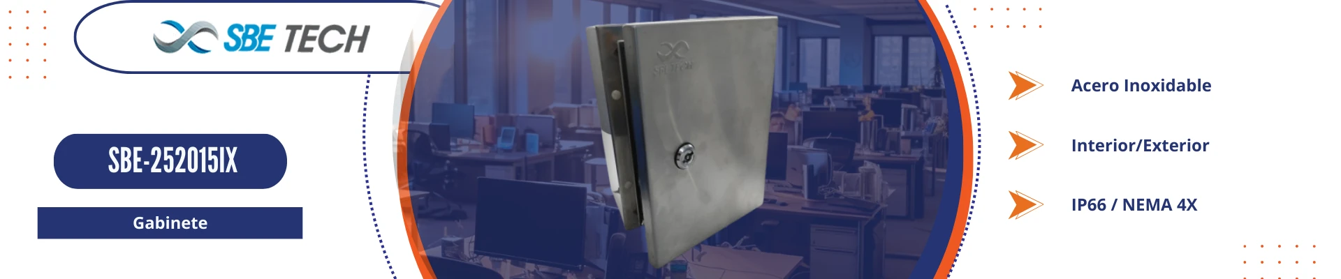 El Gabinete de Acero Inoxidable SBE-252015IX está diseñado para proteger equipos en ambientes exigentes, tanto en interiores como exteriores. Ideal para áreas con altos niveles de higiene o entornos corrosivos, como la industria química, farmacéutica, alimentaria y papelera. Su diseño incluye un marco en forma de canal para evitar el escurrimiento dentro del gabinete, asegurando una protección óptima.