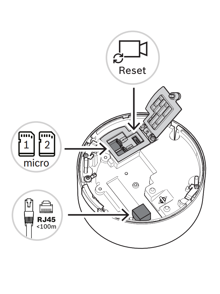 También es posible realizar la configuración y la puesta en marcha por remota más tarde, después de haber instalado todas las cámaras. Basta conectarse a la cámara de forma remota a través de la red mediante la aplicación Bosch Project Assistant, la interfaz web de la cámara o Bosch Configuration Manager.