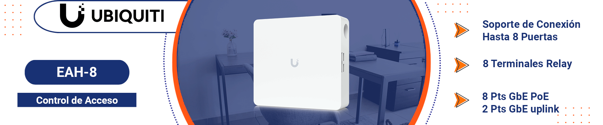 El UniFi Enterprise Access Hub (EAH-8) es una solución de control de acceso de nivel empresarial diseñada para gestionar hasta ocho puertas de manera eficiente y segura. Este dispositivo permite controlar tanto la entrada como la salida en múltiples accesos, integrándose perfectamente con la plataforma UniFi Access para una administración centralizada.