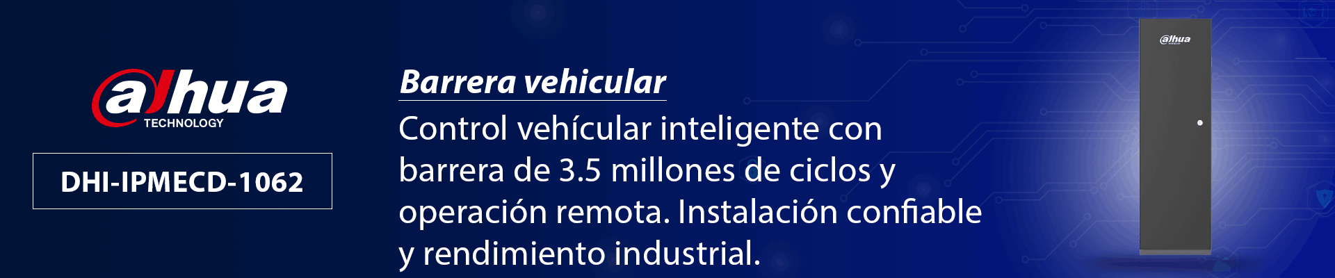 La DAHUA DHI-IPMECD-1062 es una barrera vehicular de doble dirección y motor DC sin escobillas que garantiza una vida útil prolongada de hasta 3.5 millones de ciclos. Su sistema de apertura rápida (ajustable de 2 a 6 segundos) y control remoto de hasta 50 metros la hacen ideal para zonas de acceso vehicular con alta rotación. No utiliza resorte, lo que reduce el desgaste mecánico. Su diseño robusto permite un uso continuo con rotación de motor de 2000 rpm. Ofrece integración con sistemas de control de acceso, siendo perfecta para estacionamientos, fraccionamientos y áreas industriales.