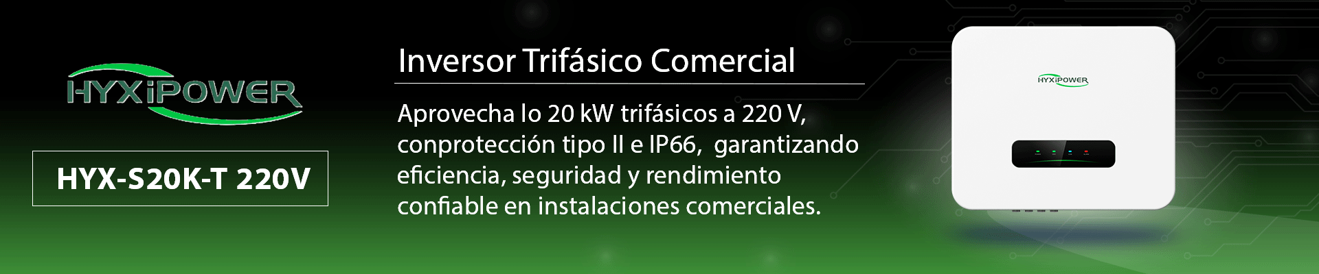 El inversor trifásico de cadena HYX-S20K-T 220V de HYXiPOWER está diseñado para maximizar el rendimiento energético en instalaciones fotovoltaicas comerciales e industriales. Gracias a su tecnología de punta y con 20,000W de potencia, ofrece operación eficiente, segura y de fácil mantenimiento. Su diseño con refrigeración natural optimiza la durabilidad y reduce costos operativos. Ofrece una integración versátil con diferentes tipos módulos solares, garantizando flexibilidad en el diseño del sistema.
