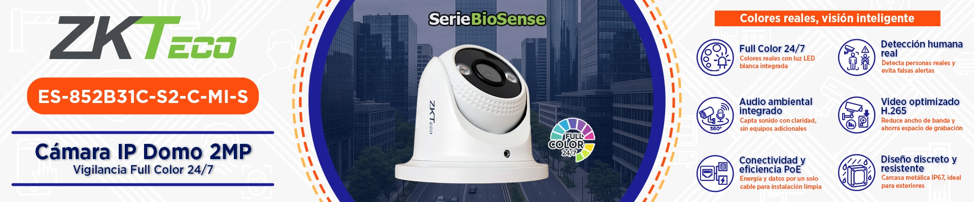 La ZKTeco ES-852B31C-S2-C-MI-S es una cámara IP tipo domo (eyeball) de la serie ZKBio Sense Entry, diseñada para ofrecer videovigilancia inteligente y confiable en entornos donde se requiere alta definición con operación sencilla.