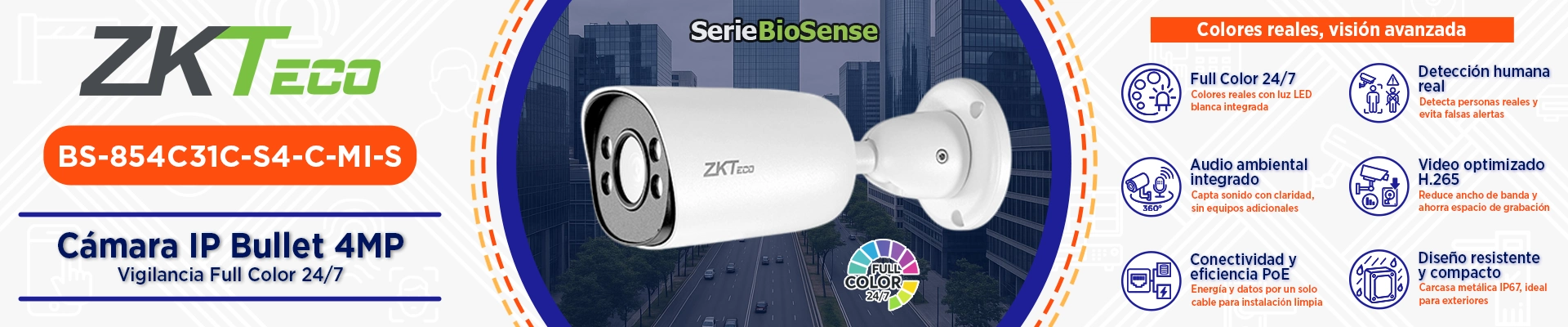La BS-854C31C-S4-C-MI-S pertenece a la Serie ZKBio Sense Entry, una línea de cámaras IP inteligentes que combinan alta definición, análisis avanzado e instalación sencilla. Equipada con un sensor de 4 megapíxeles y un lente fijo de 2.8 mm, esta cámara ofrece imágenes nítidas, brillantes y a color las 24 horas, incluso en completa oscuridad, gracias a sus LED de luz blanca Full Color.