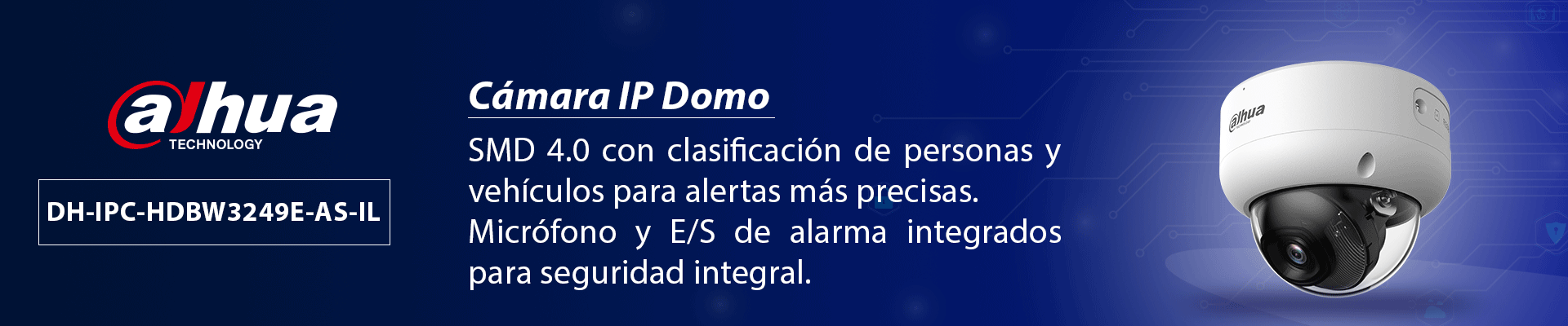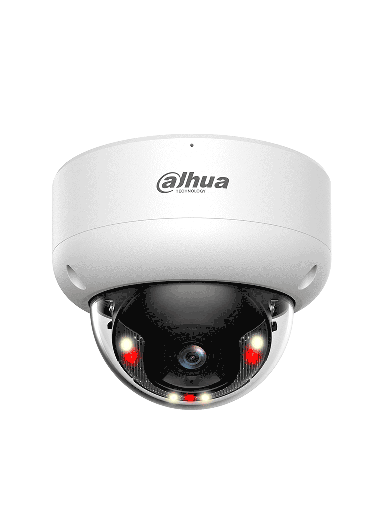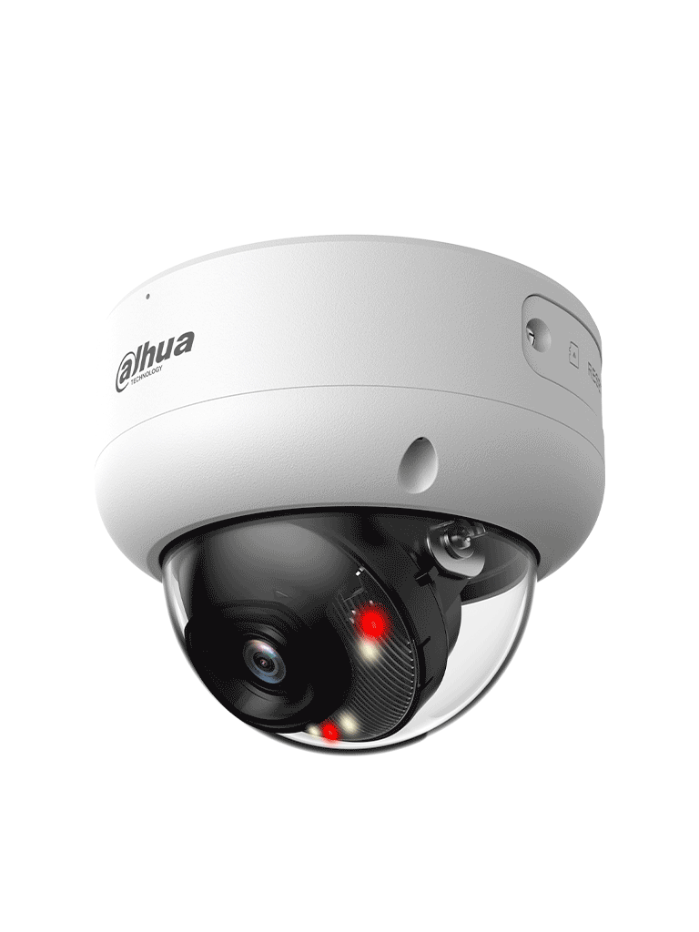 La DAHUA DH-IPC-HDBW3249EP-AS-IL-0280B es una cámara IP domo antivandálica de 2 MP perteneciente a la serie WizSense de Dahua que integra funciones avanzadas de inteligencia artificial como SMD 4.0, detección de intrusión y cruce de línea con clasificación de humanos y vehículos. Tiene iluminación dual inteligente con LEDs IR y luz cálida de hasta 40 m, compresión eficiente, ranura para tarjeta MicroSD de hasta 512 GB, y entradas/salidas de alarma y audio con micrófono incorporado. Su carcasa metálica IP67 e IK10 está diseñada para resistir condiciones exteriores exigentes.