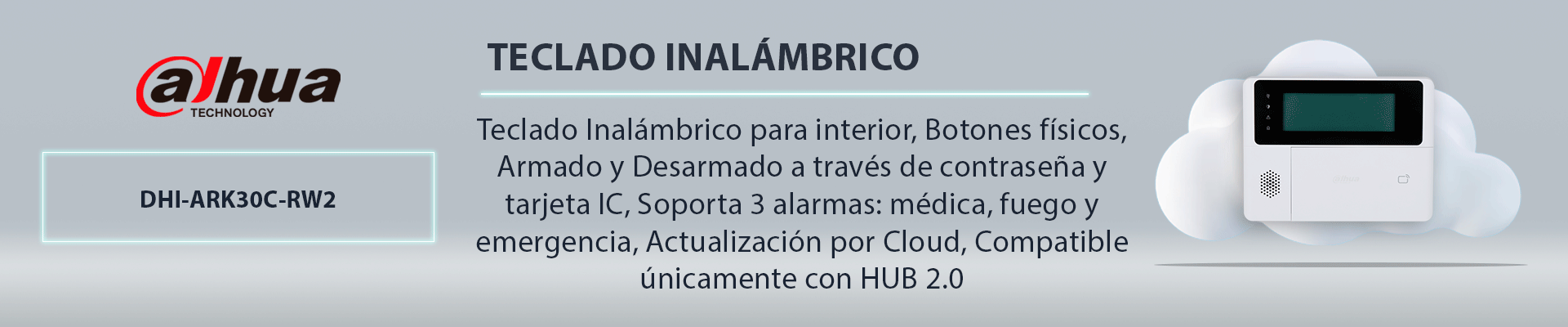 El teclado inalámbrico Dahua DHI‑ARK30C‑RW2 está diseñado para controlar sistemas de alarma desde interiores. Cuenta con una pantalla LCD, 20 botones táctiles, y dos buzzer integrados. Permite armar y desarmar mediante contraseña o tarjeta IC/DESFire, además de ofrecer atajos para alarmas médica, fuego y emergencia. Dispone de indicadores LED para alimentación, armado, fallo y alarma. Su comunicación bidireccional por 868 MHz con cifrado AES128 y salto de frecuencia garantiza seguridad y estabilidad, con un alcance de hasta 1 600 m. Incluye actualizaciones por nube con recuperación automática ante fallos. Opera con 12 VDC o 4 baterías CR123A. Este teclado es compatible unicamente con Hub2.0