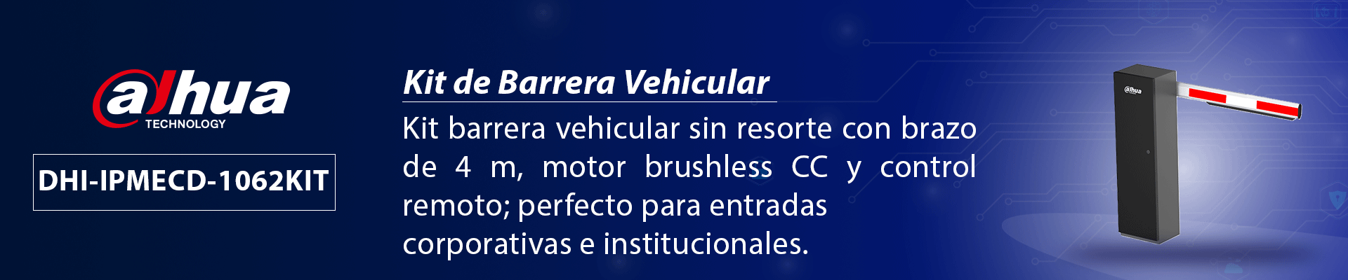 El DHI-IPMECD-1062KIT combina una barrera vehicular de doble dirección equipada con motor DC sin escobillas, capaz de abrirse en 2 a 6 segundos según peso del brazo. Incorpora funciones inteligentes como elevación automática ante obstrucción, control remoto hasta 50 m, contabilización de pasos y registro vía RS-485. Soporta 3.5 millones de ciclos y es resistente al clima con protección IP54. Su carcasa metálica anticorrosión soporta impactos; el kit incluye un brazo de aluminio de 4 m con pintura electrostática y tira de goma anti-choques. Ideal para entradas en escuelas, empresas y residenciales.