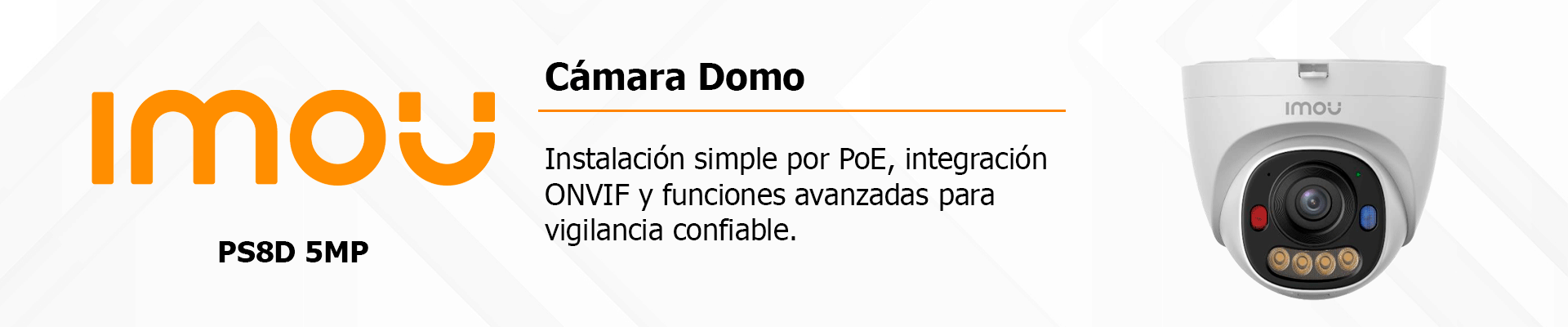 La PS8D – 5MP Cámara Domo ofrece vigilancia robusta con resolución de 5 megapíxeles y compresión H.265 para optimizar almacenamiento y ancho de banda. Su tecnología Smart Color permite obtener imágenes en color incluso en la noche, mientras que la disuasión activa aplica señales visuales o auditivas para ahuyentar intrusos. Incorpora detección de humanos y vehículos, micrófono integrado, y soporte para microSD de hasta 512 GB. Se alimenta por PoE para instalación sencilla y segura, y está diseñada para ambientes exteriores con grado IP67. Además, es compatible con ONVIF y cuenta con modo AOR para escenarios complejos.