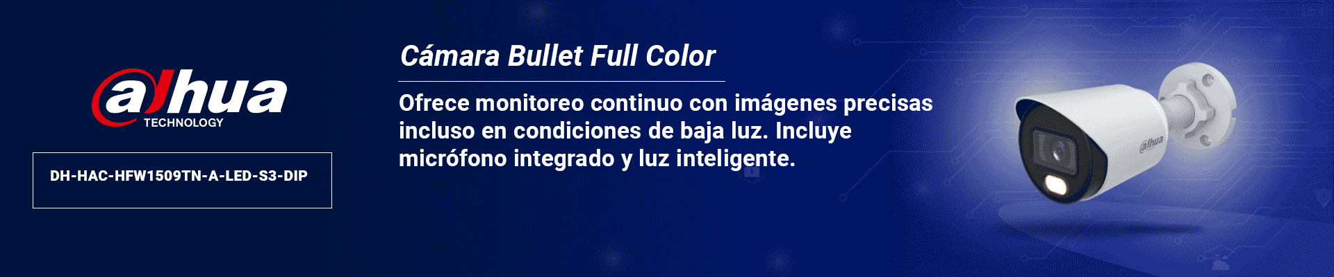 La cámara DH-HAC-HFW1509T-A-LED es una cámara tipo bala de la Serie Lite, diseñada para brindar monitoreo económico pero de alto rendimiento. Cuenta con un sensor CMOS de 5 MP, lente fija y tecnología Full Color para capturar imágenes nítidas y detalladas en cualquier condición de luz. Su luz inteligente+ evita reflejos e ilumina de forma uniforme hasta 30 metros. Gracias al WDR de 120 dB y el 3DNR, obtiene mayor claridad incluso con sombras y contraluz. Además, integra micrófono y soporta múltiples formatos de salida como CVI, TVI, AHD y CVBS. Posee certificación IP67 para uso exterior.
