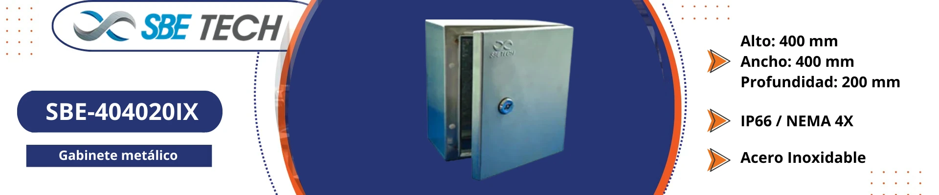 El Gabinete de Acero Inoxidable SBE-404020IX está diseñado para uso en interiores y exteriores, especialmente en entornos donde se requiera alta resistencia a la corrosión. Su estructura con marco en forma de canal evita el escurrimiento de líquidos dentro del gabinete, lo que lo hace ideal para industrias químicas, farmacéuticas y de alimentos.