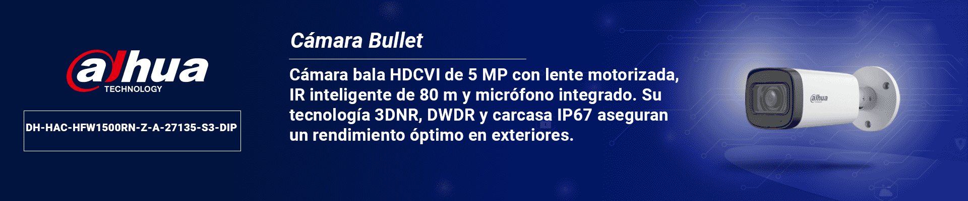 La cámara HDCVI DH-HAC-HFW1500R-ZA de Dahua ofrece una solución profesional para videovigilancia con resolución de 5 MP y una lente varifocal motorizada de 2.7 a 13.5 mm, ideal para ajustar la escena sin intervención física. Cuenta con iluminación IR inteligente de hasta 80 m, tecnología Starlight y 3DNR para un mejor rendimiento en baja iluminación. Su micrófono integrado permite transmitir audio por coaxial, garantizando evidencia adicional. Con protección IP67, amplio rango de voltaje y compatibilidad con CVI/TVI/AHD/CVBS, es adecuada para exteriores, empresas y hogares que requieren calidad, versatilidad y resistencia.