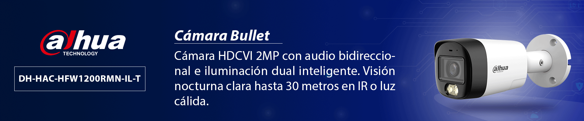 La DAHUA DH-HAC-HFW1200RMN-IL-T es una cámara bullet HDCVI de 2 megapíxeles diseñada para sistemas de videovigilancia analógicos de alta definición. Incorpora tecnología HDCVI X PLUS que permite transmisión de video y audio bidireccional por coaxial. Cuenta con iluminación dual inteligente que alterna entre IR y luz cálida según el entorno, ofreciendo imágenes claras en total oscuridad hasta 30 metros. Integra reducción de ruido 3D NR para mejorar la calidad de imagen en condiciones de baja iluminación. Su carcasa metálica con protección IP67 la hace ideal para instalaciones en exteriores con alta resistencia a polvo y lluvia.