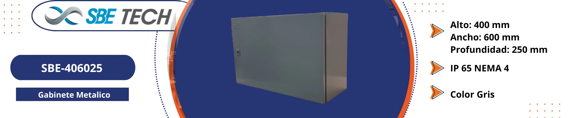 Forma parte de la familia de gabinetes SBE TECH con grado de protección IP65 y NEMA 4, ideales para ambientes exigentes con presencia de polvo, lluvia y condiciones ambientales adversas.
