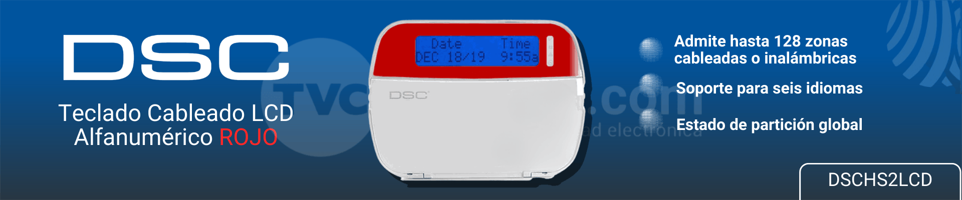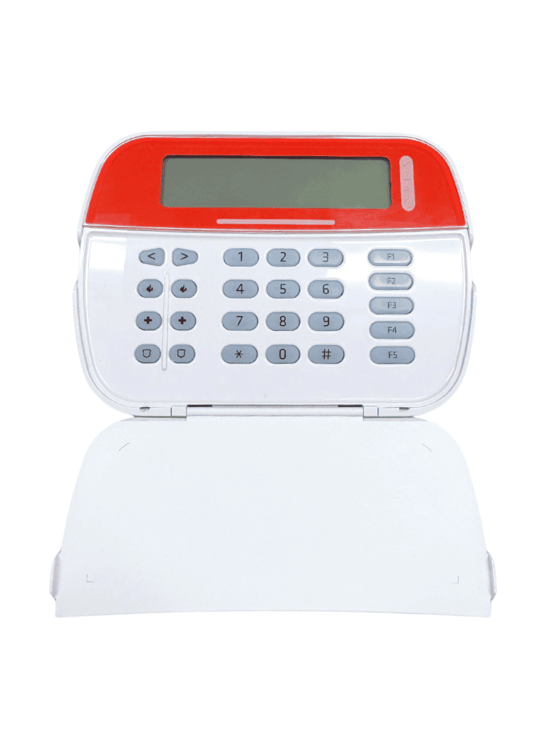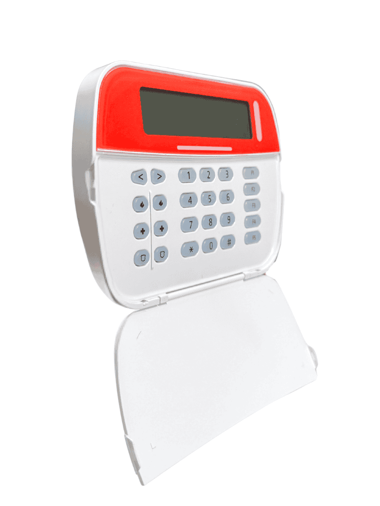 El teclado de DSC HS2LCD color rojo es el teclado principal de control para el sistema PowerSeries NEO. Su pantalla LCD alfanumérica de 32 caracteres permite una gestión intuitiva y completa de la seguridad, facilitando la lectura de eventos y la programación del sistema mediante etiquetas personalizadas.