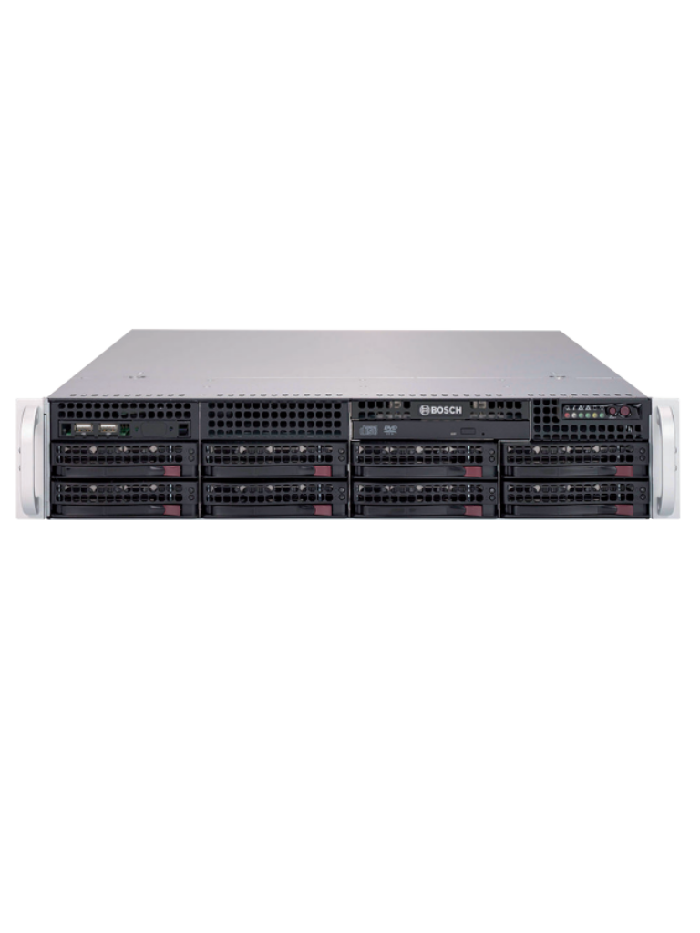 DIVAR IP 7000 2U cuenta con fuentes de alimentación redundantes e intercambiables en caliente de alta eficiencia energética y discos duros SATA-3 reemplazables desde la parte frontal que proporcionan hasta 64 TB de capacidad de almacenamiento bruta. Todo el software del sistema está preinstalado y preactivado, lo que lo convierte en un dispositivo de gestión de vídeo listo para usar desde el primer momento. Utiliza Microsoft Windows Storage Server 2012 R2.