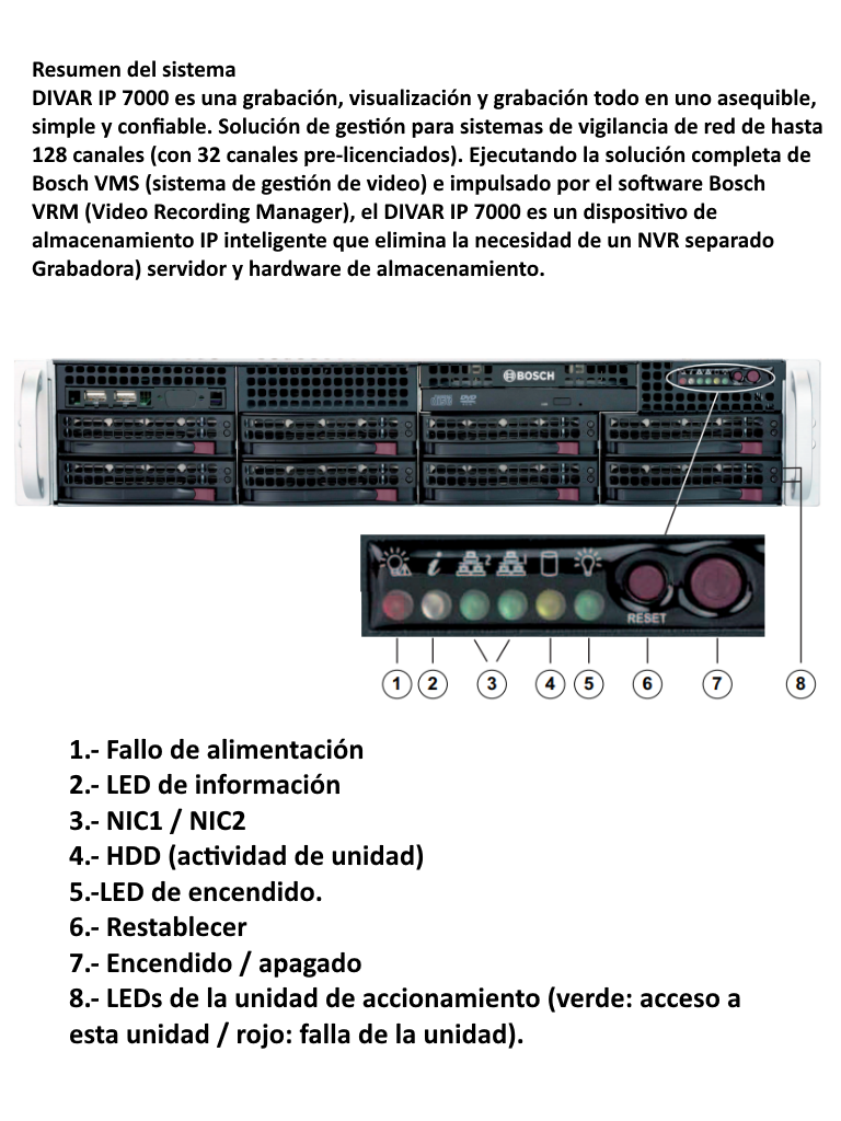 La familia DIVAR IP 7000 utiliza un diseño integrado con uso eficiente de la energía que reduce los posibles puntos de fallo y ofrece la calidad total de Bosch. El uso de discos duros de altas prestaciones en configuración RAID-5 con tolerancia a fallos, interfaz de red Gigabit Ethernet de dos puertos, memoria del sistema de 8 GB y un procesador Intel Xeon Quad Core permite al dispositivo proporcionar un rendimiento de gama alta a un precio muy razonable. El sistema, fácil de instalar y usar, se puede configurar con un asistente y dispone de configuración centralizada. Todos los componentes están preinstalados y cuentan con licencia previa. El sistema DIVAR IP está listo para empezar a grabar desde el primer momento, solo tiene que conectarlo a la red y encenderlo.